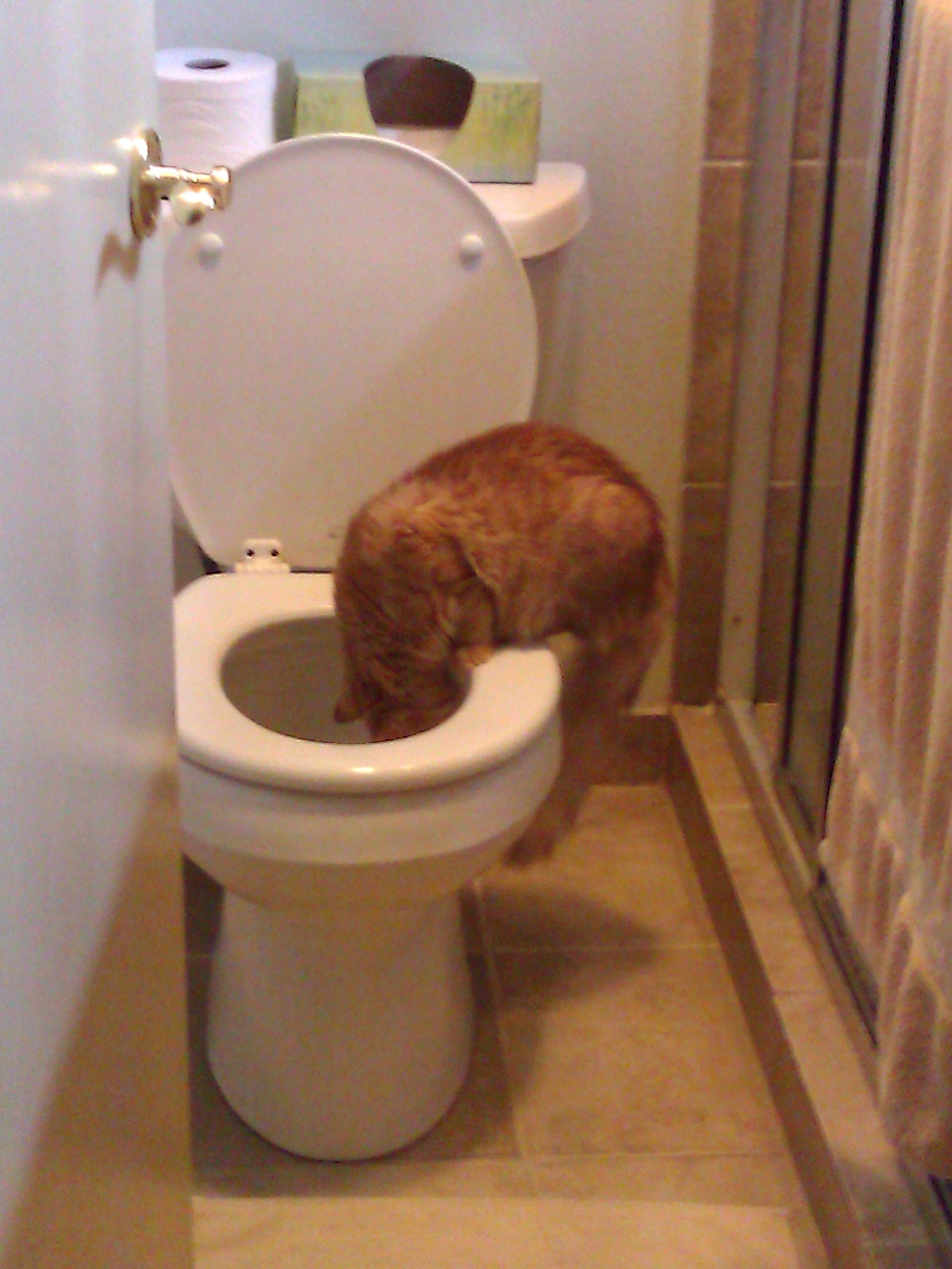 Since he was so young and no mama to lick him clean, I had a routine of bathing him. He loved it. Being in the water didn’t seem to bother him at all. I’d blow his fur dry, wrap him in a towel and he’d fall asleep, just like a real baby. That was our first clue that he likes water. Once he got big enough to have the run of the house, we noticed that he had a fascination with the toilet. He’d put his paws on the toilet seat and watch the flushing action–we call it a swirly. The bigger he got and the more agile, he would run into the bathroom when either my husband or I would go in there. He even followed our friend Larry into the bathroom. Frank gave him quite a start when he came up between his legs to watch the action.