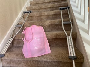 Back home my journey continued. I live alone in a two-story condo with my bedroom upstairs. From the moment I fell the thought uppermost in my mind–well, maybe second-most under how to get out of there–was how to manage at home. Ever since I bought and moved into my condo I’ve wondered what would happen if I couldn’t get up and down the stairs. Now that it is reality, what I do is crawl on my knees going up and down on my butt moving my crutches and a bag with my belongings in it as I progress up or down. It’s inconvenient to say the least, but it works and it’s good exercise.